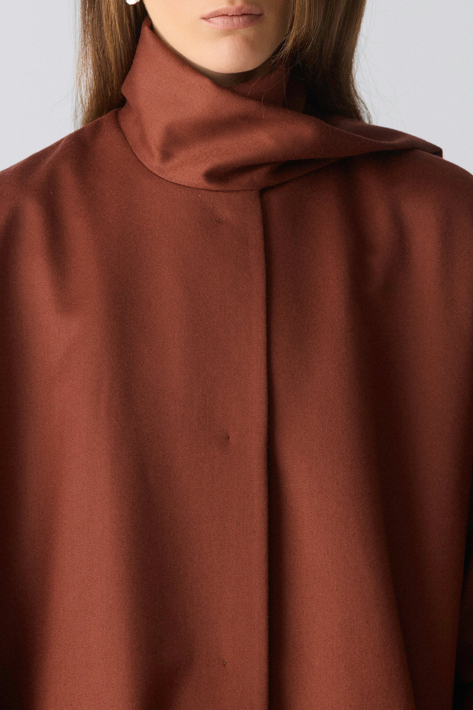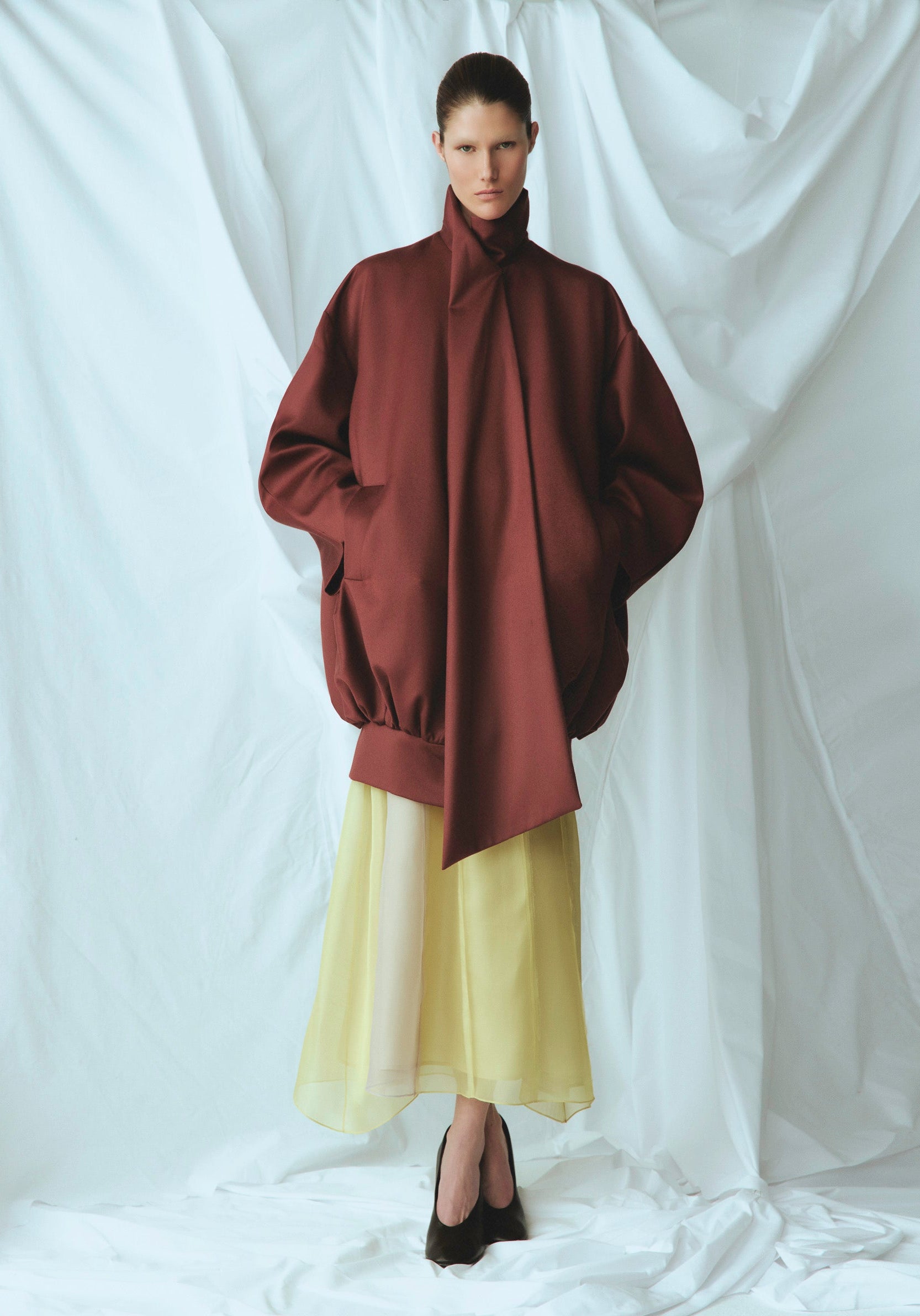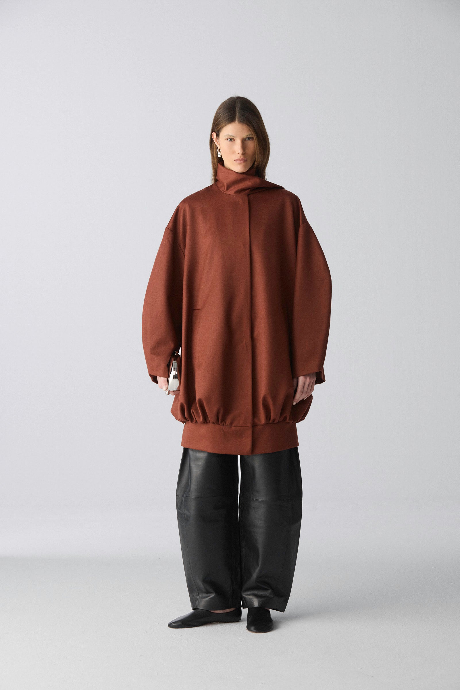Abrigo de lana y seda de silueta amplia y estructura limpia. El cuello envolvente integra una tira frontal fluida que cae por el delantero o puede colocarse sobre el brazo, aportando movimiento y versatilidad.