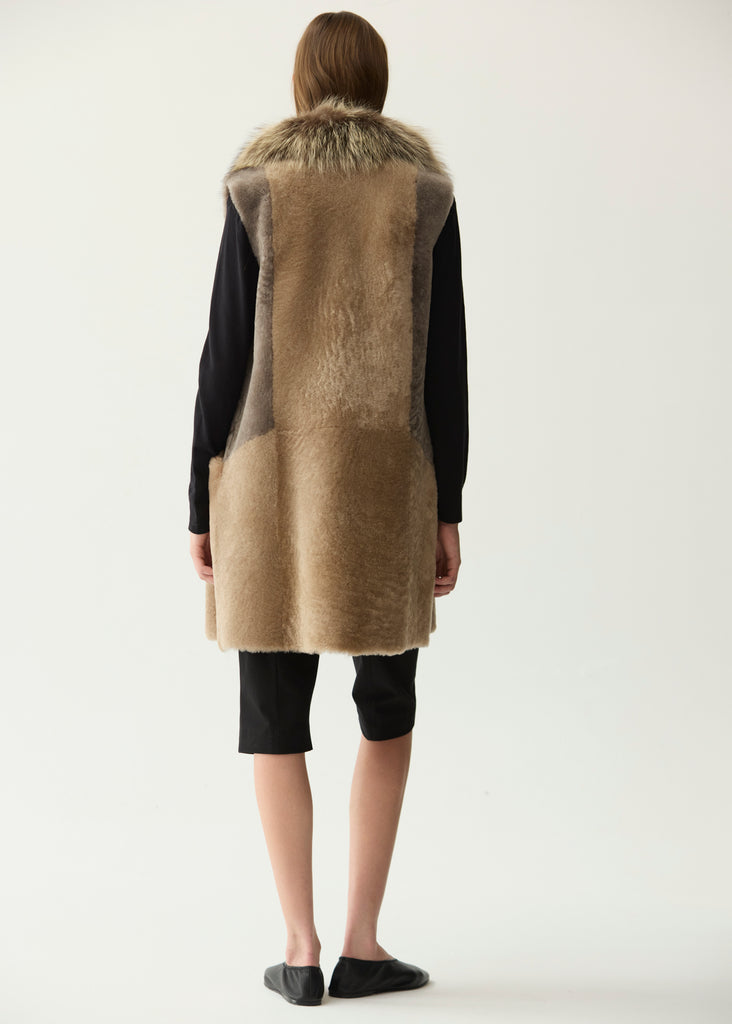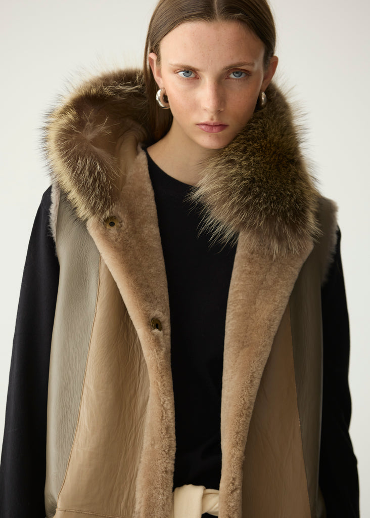 Chaleco de la firma Miguel Marinero en cordero merino reversible y cuello de pelo largo. Versatilidad para combinar con cualquier look de tu armario, por el color fácilmente combinable y porque es reversible, con una terminación en piel de napa y otra en pelo suave y cálido. Estilo casual y relajado, pensado para usarlo en los días más fríos en el interior de un abrigo.