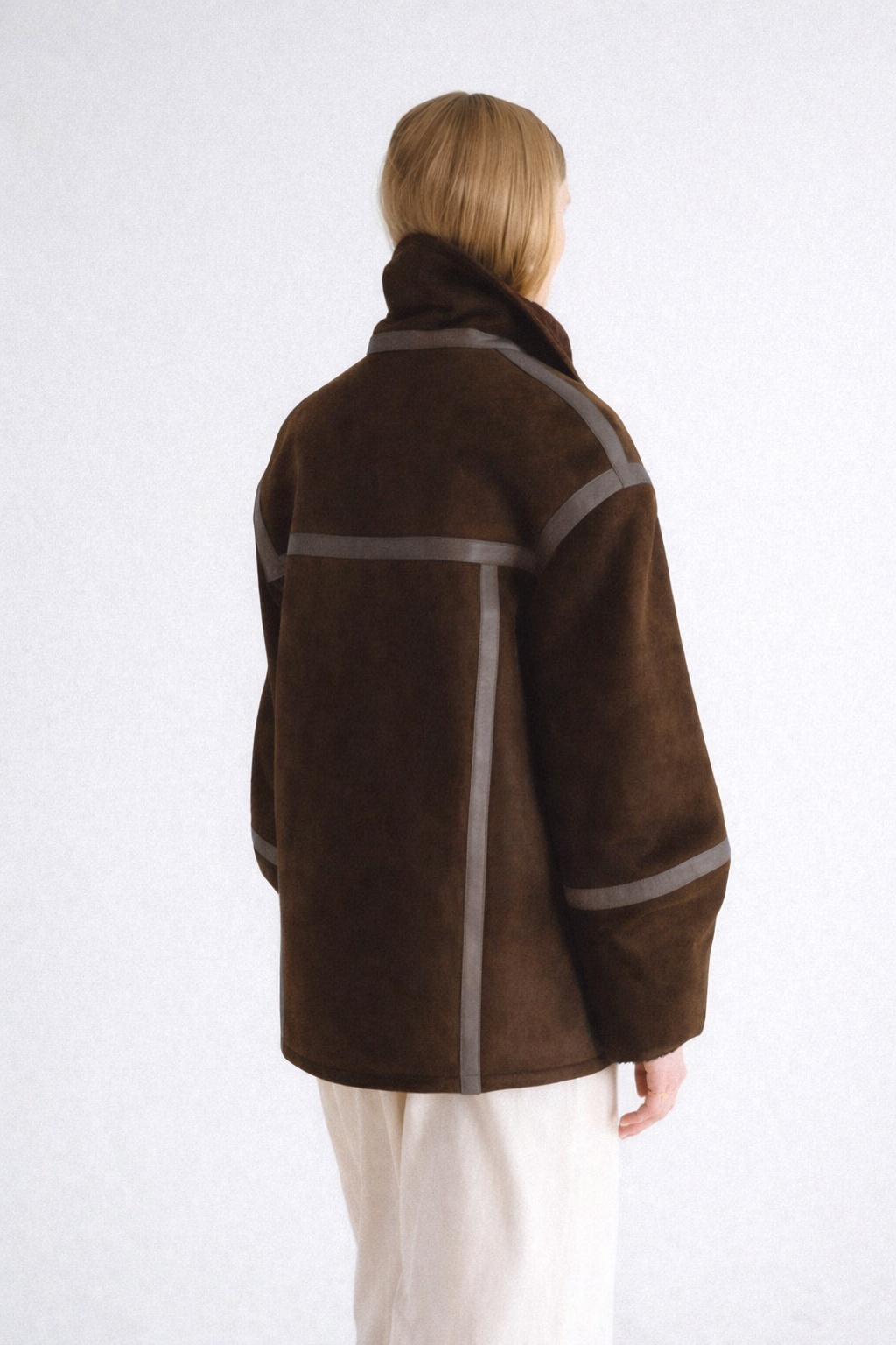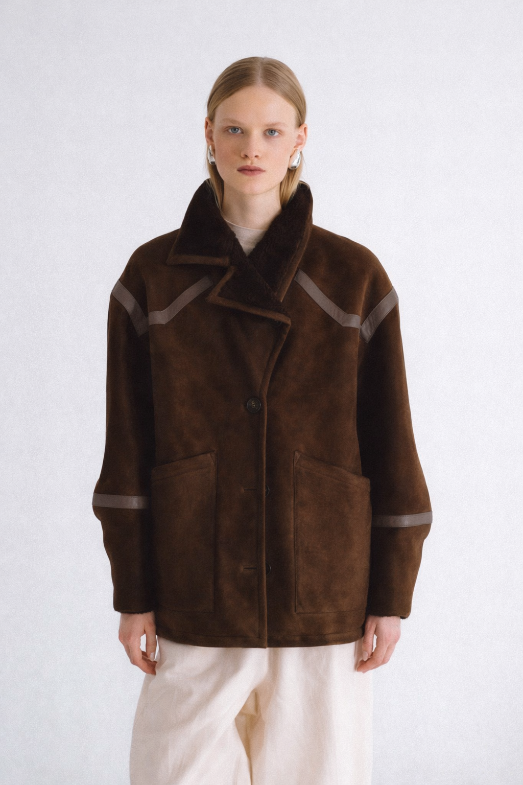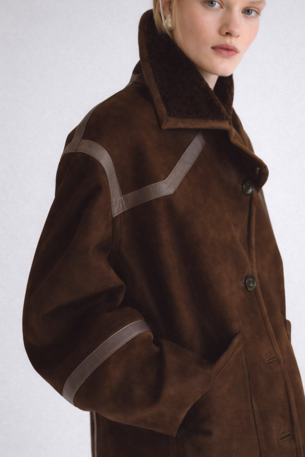 Chaqueta larga de la firma Miguel Marinero en cordero merino rizado color marrón con un original cuello asimétrico multiposición. Versatilidad con una terminación anteada y otra en pelo corto y rizado. Estilo trendy con detalles en cuero, cierre con botones MM y color neutro muy combinable.